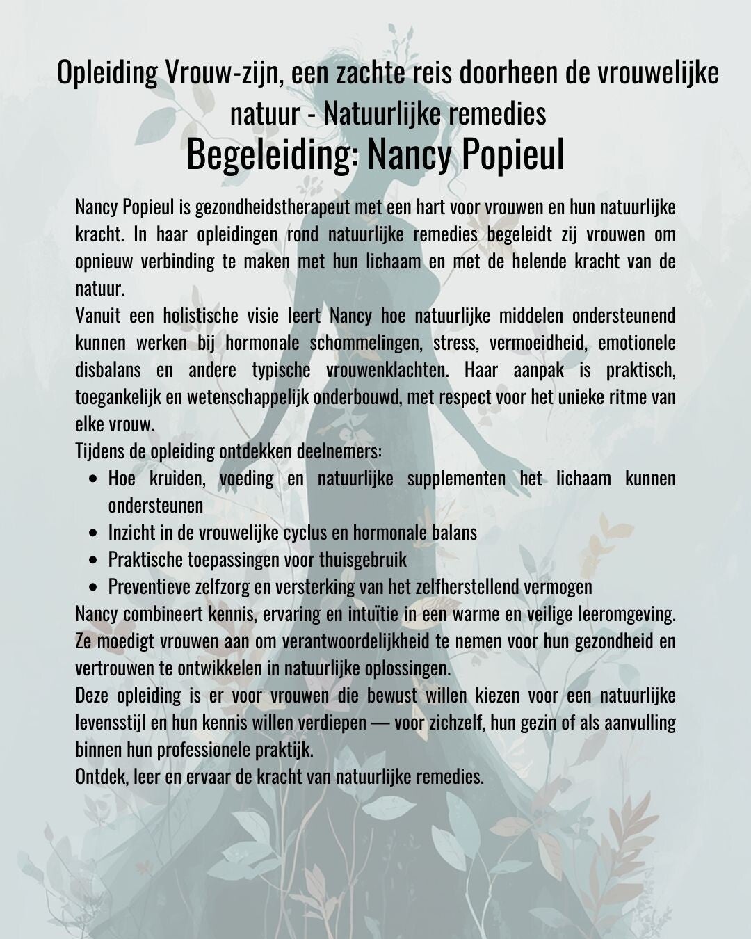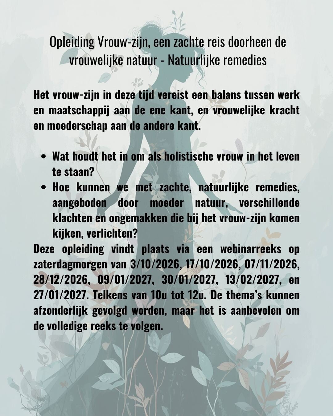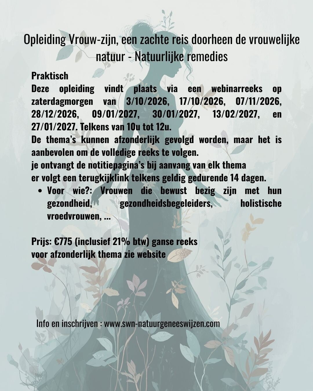 - Voor wie?: Vrouwen die bewust bezig zijn met hun gezondheid, gezondheidsbegeleiders, holistische vroedvrouwen, ...